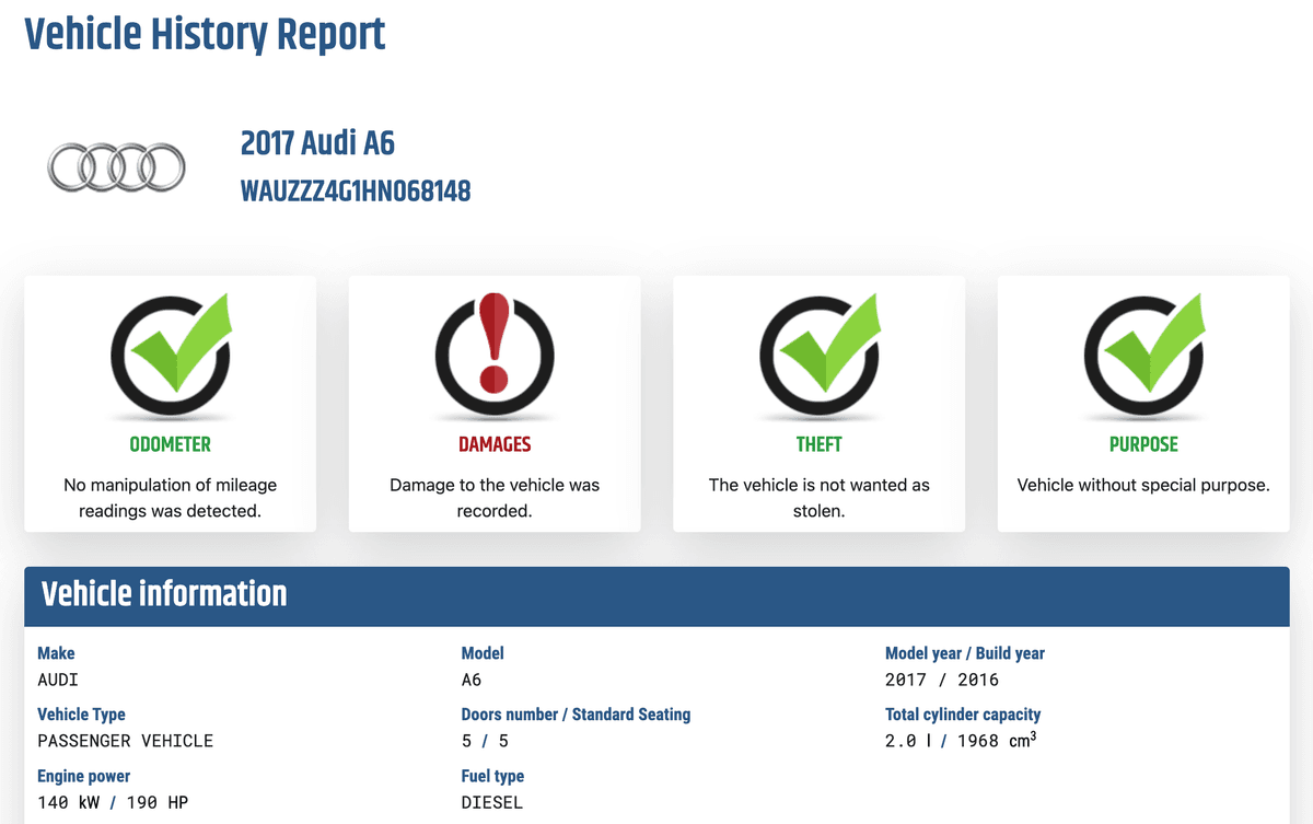 Standard Report: This report contains more comprehensive data, including ownership history, title information, and accident records. The standard report is priced at 26.90€.