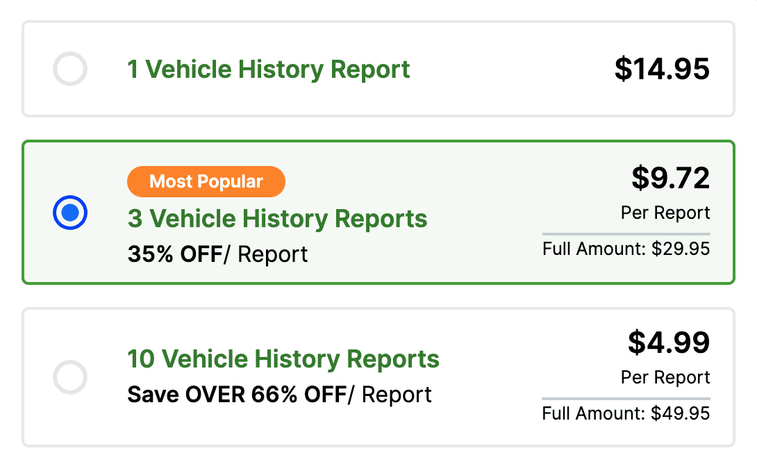 - Two Reports: $29.95 – This option allows users to access two vehicle history reports.